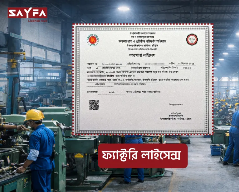 ফ্যাক্টরি লাইসেন্স রেজিস্ট্রেশন হলো যেকোনো শিল্প বা উৎপাদনমুখী প্রতিষ্ঠান পরিচালনার জন্য একটি গুরুত্বপূর্ণ আইনগত অনুমোদন। শ্রমিকের নিরাপত্তা, কর্মপরিবেশ, স্বাস্থ্যবিধি ও কারখানার কাঠামোগত মান যাচাইয়ের পর এই লাইসেন্স প্রদান করা হয়। ফ্যাক্টরি লাইসেন্স ছাড়া উৎপাদন কার্যক্রম পরিচালনা করলে আইনগত জটিলতা ও জরিমানার সম্মুখীন হতে হয়।